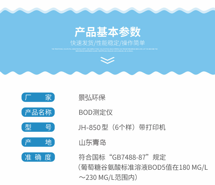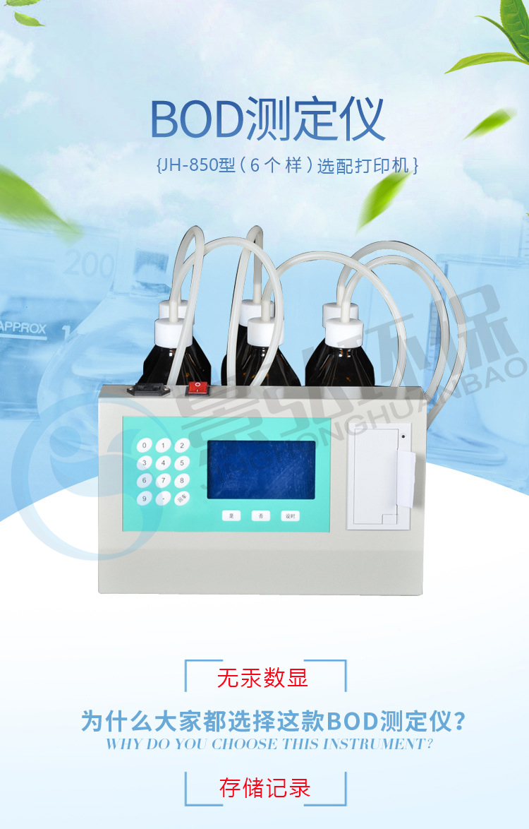 JH-850微電腦數(shù)顯式BOD測(cè)定儀是利用空氣壓差法進(jìn)行生化需氧量測(cè)定的一種儀器,能提供與化學(xué)稀釋法可比的測(cè)定結(jié)果,具有讀數(shù)直觀,生化反應(yīng)曲線一目了然和使用維護(hù)方便等特點(diǎn),可應(yīng)用于環(huán)保監(jiān)測(cè)、石油化工、醫(yī)療衛(wèi)生、教學(xué)科研等部門對(duì)水質(zhì)的監(jiān)測(cè)。