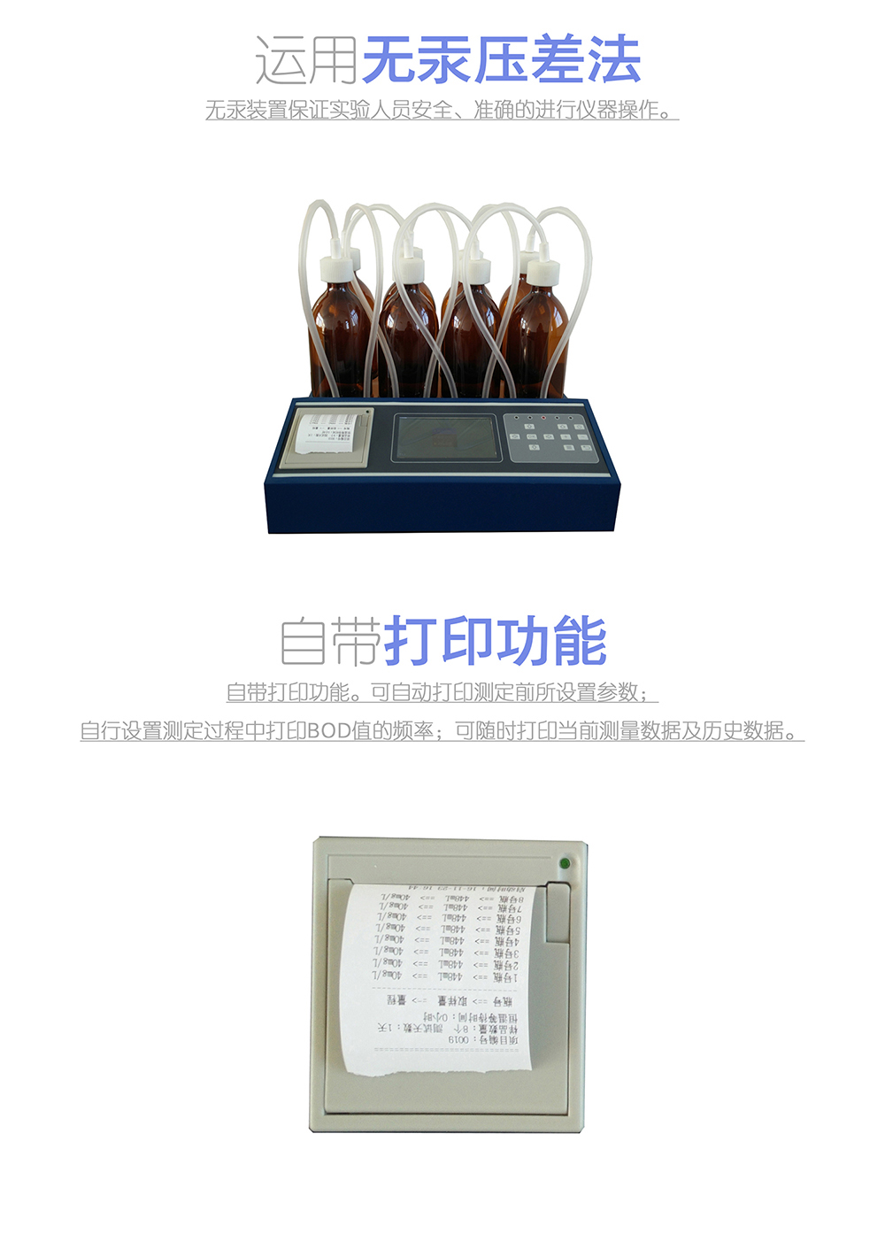 3、 自帶打印功能??勺詣?dòng)打印測(cè)定前所設(shè)置參數(shù);自行設(shè)置測(cè)定過程中打印BOD值的頻率;可隨時(shí)打印當(dāng)前測(cè)量數(shù)據(jù)及歷史數(shù)據(jù)。