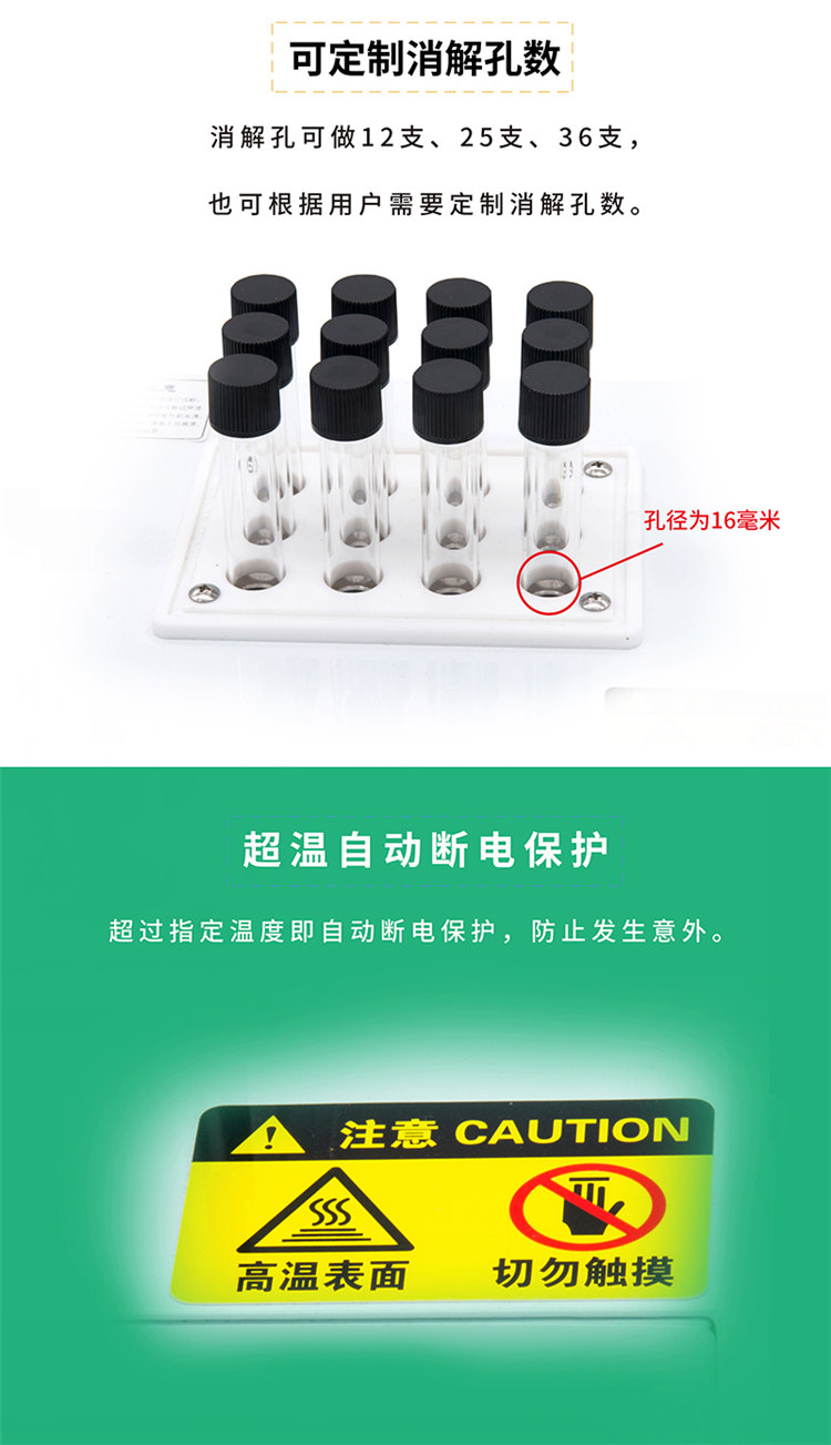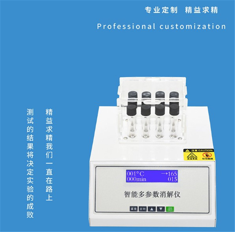 JH-YX系列COD快速消解儀是一種快速測定化學(xué)耗氧量的加熱裝置??蛇M(jìn)行COD、總磷、總氮等樣品消解預(yù)處理。該儀器可以自動(dòng)完成恒溫計(jì)時(shí)時(shí)間,時(shí)間設(shè)定1-999分鐘,溫度恒定時(shí)間到達(dá)后儀器具有自動(dòng)聲報(bào)警功能,自動(dòng)關(guān)機(jī),無需人工參與。溫度漂移小,恒溫精度高。它采用PID溫控器,時(shí)間控制器、升溫速度較快,溫度緩沖小、溫度恒定均勻等特點(diǎn),操作簡便,是一種實(shí)驗(yàn)手段儀器化產(chǎn)品。同現(xiàn)行的重鉻酸鉀法測定化學(xué)需氧量的回流裝置相比,具有體積小、節(jié)水、節(jié)電、恒溫性能好等優(yōu)點(diǎn)。適用于加熱快速測定化學(xué)耗氧量COD,所得數(shù)據(jù)與經(jīng)典方法對應(yīng),可廣泛用于環(huán)保、高等院校、醫(yī)藥、衛(wèi)生、食品、自來水、化工、污水處理、造紙、石化、冶金、印染等行業(yè),使COD的示值測量高效、快速、經(jīng)濟(jì)。