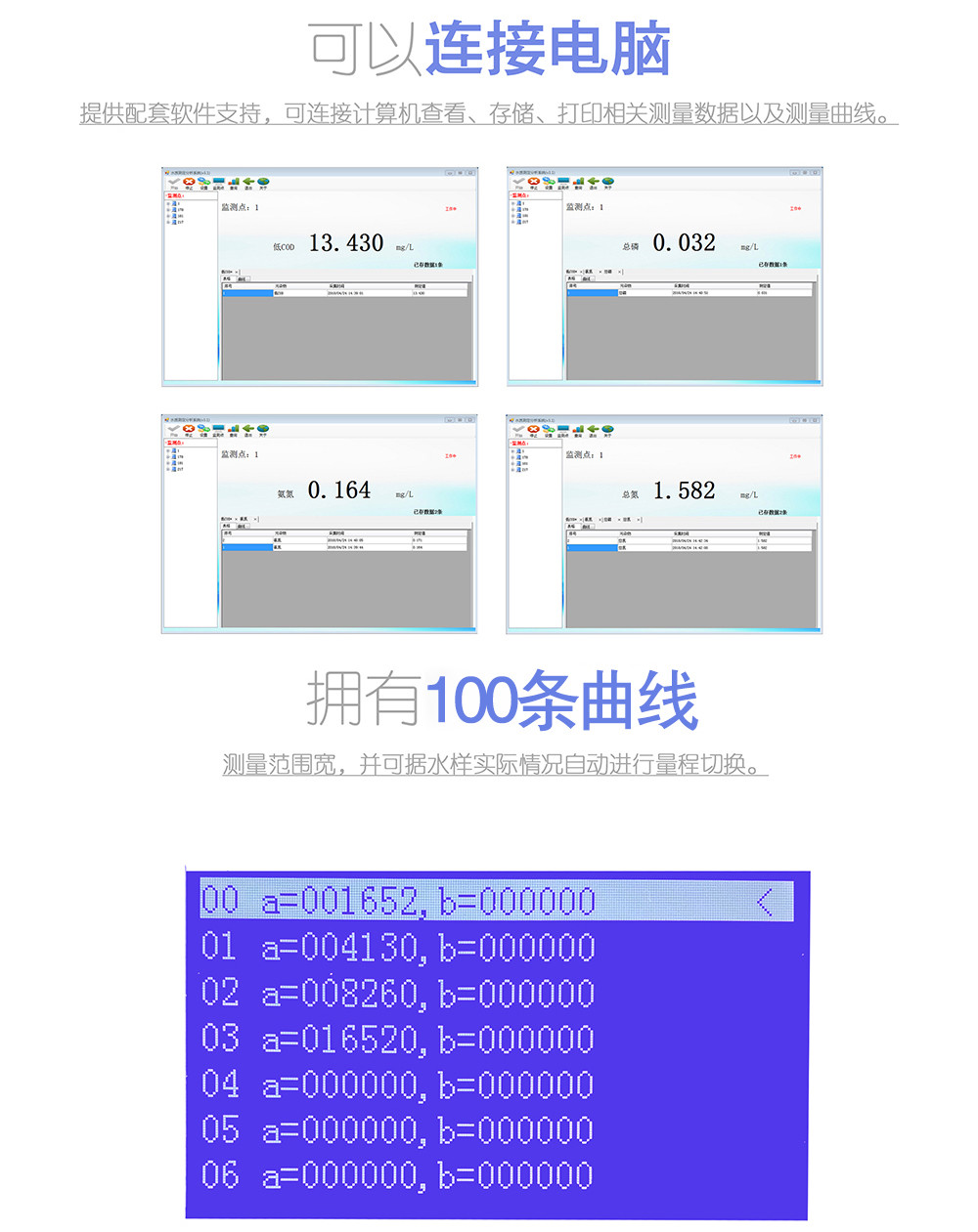 5. 1點(diǎn)至7點(diǎn)校正模式,自動(dòng)計(jì)算斜率、截距及相關(guān)系數(shù),測量精度高。